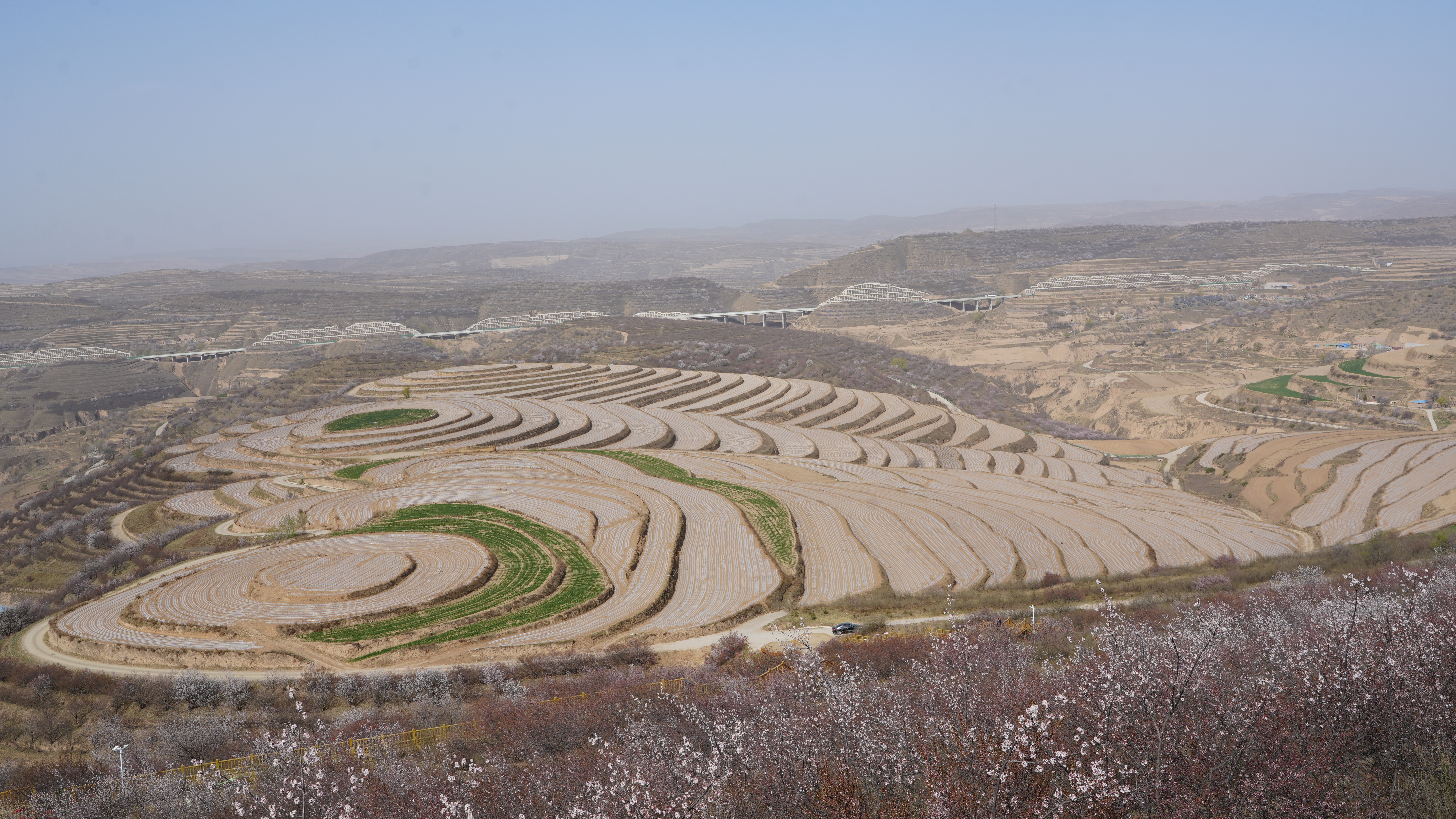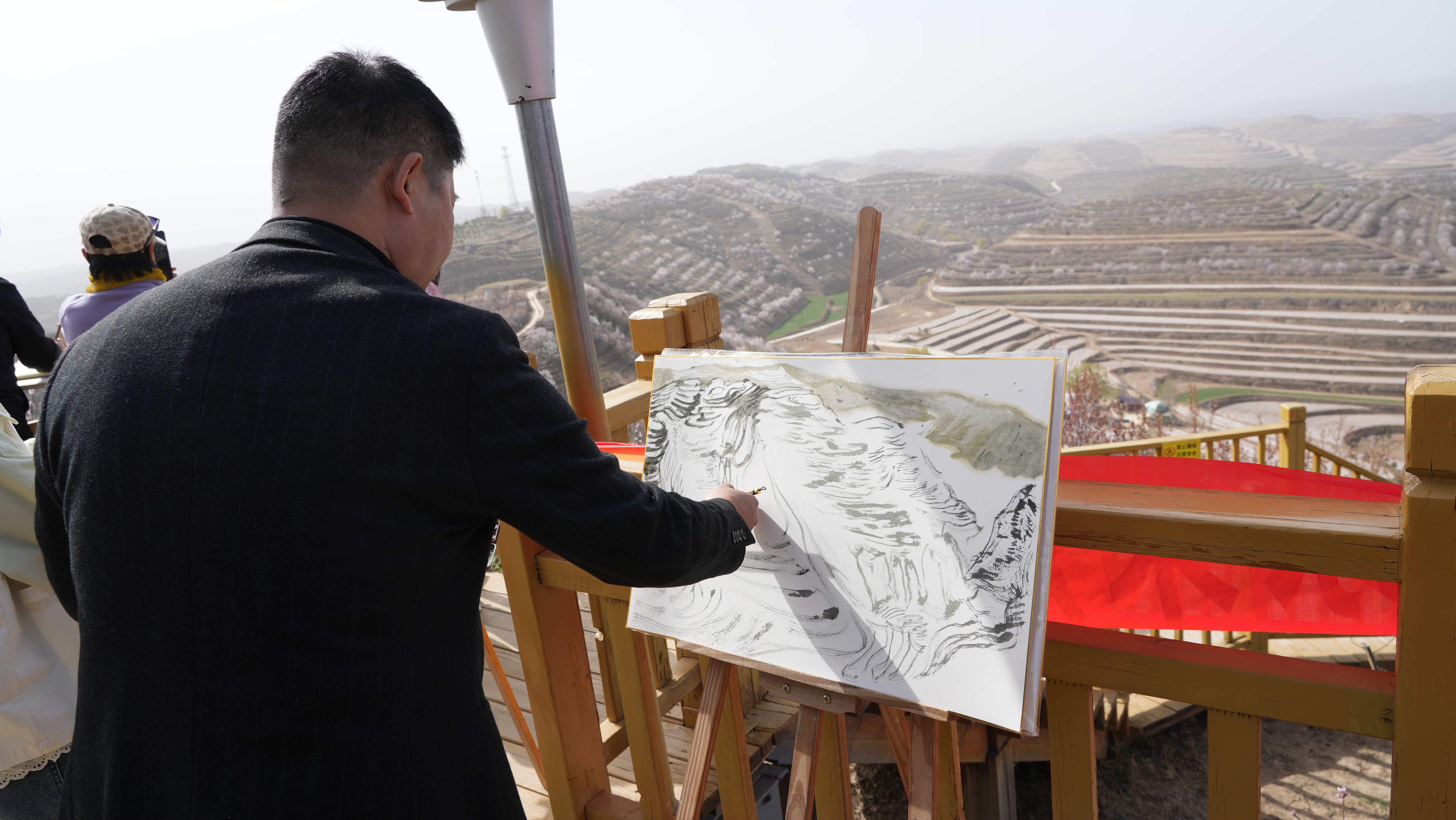 活動(dòng)期間,采訪團(tuán)先后走進(jìn)金雞坪梯田公園、城陽鄉(xiāng)長城塬閩寧現(xiàn)代循環(huán)科技示范園、喬家渠紅軍長征毛澤東宿營地、茹河瀑布等地,深入了解彭陽縣的發(fā)展歷程,實(shí)地探訪彭陽生態(tài)治理成效,感受閩寧協(xié)作在產(chǎn)業(yè)振興領(lǐng)域的豐碩成果,踏尋紅色足跡、感悟革命精神。秀美風(fēng)光與厚重人文激發(fā)了采風(fēng)團(tuán)成員的創(chuàng)作熱情,大家執(zhí)起畫筆,巧思構(gòu)圖,將梯田花海、文化特色、人文風(fēng)情等融入自己的創(chuàng)作中,用一幅幅書畫佳作展現(xiàn)當(dāng)?shù)匕l(fā)展新氣象,抒發(fā)人民對美好生活的向往。“這里獨(dú)特的環(huán)境特別適合我們采風(fēng)寫生,我原本專攻花鳥創(chuàng)作,也忍不住被梯田美景打動(dòng),變成了山水畫家。”長安中國畫院常務(wù)副院長劉嵐說。