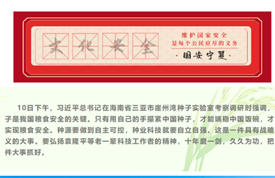 10日下午,習(xí)近平總書(shū)記在海南省三亞市崖州灣種子實(shí)驗(yàn)室考察調(diào)研時(shí)強(qiáng)調(diào),種子是我國(guó)糧食安全的關(guān)鍵。只有用自己的手攥緊中國(guó)種子,才能端穩(wěn)中國(guó)飯碗,才能實(shí)現(xiàn)糧食安全。種源要做到自主可控,種業(yè)科技就要自立自強(qiáng)。這是一件具有戰(zhàn)略意義的大事。要弘揚(yáng)袁隆平等老一輩科技工作者的精神,十年磨一劍,久久為功,把這件大事抓好。